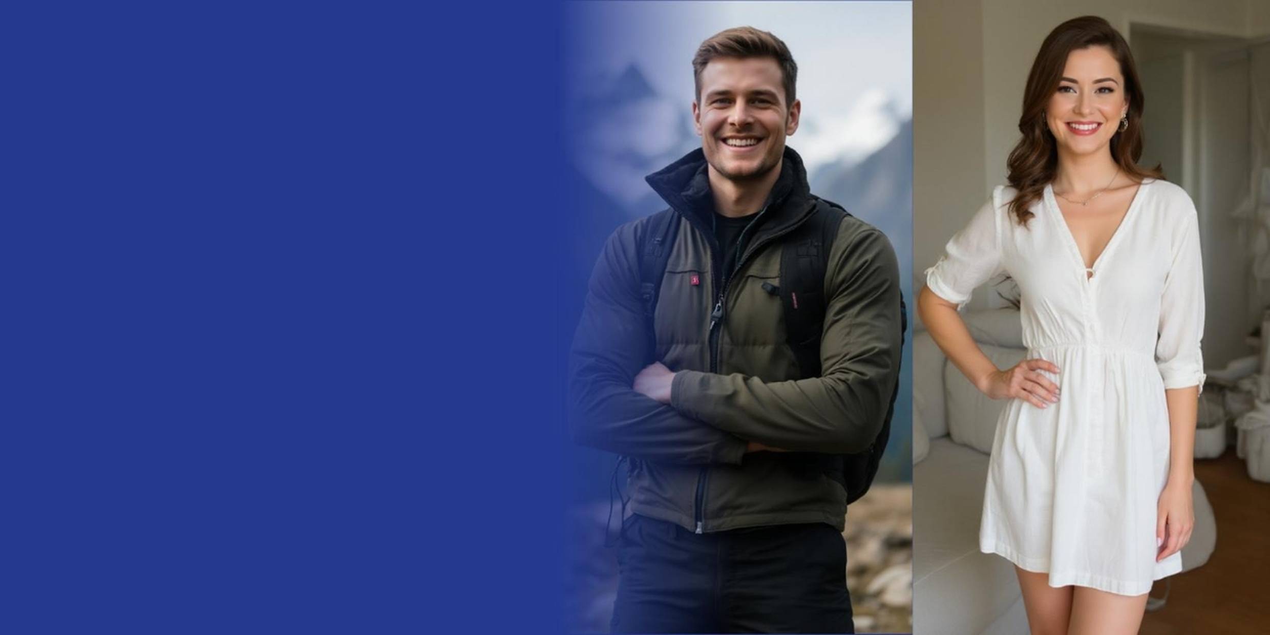 一位身材匀称的男模穿着户外夹克,背着登山包,背景是山峰